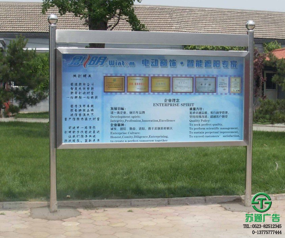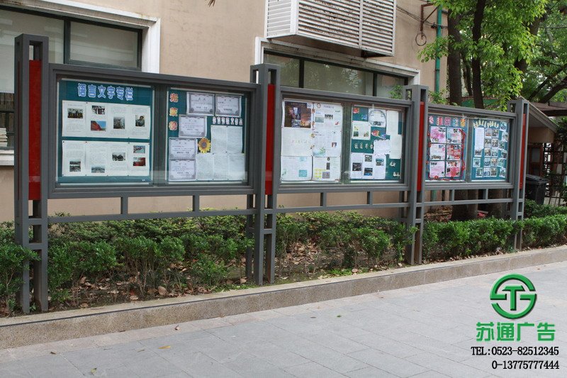 鋼板和不銹鋼板的公告欄會采用鋼板烤漆的工藝,表面進行防腐處理。可埋于地面以下,也可用膨脹螺絲固定在硬化地板表面。為了遮擋陽光和雨水,宣傳欄一般會有頂棚。